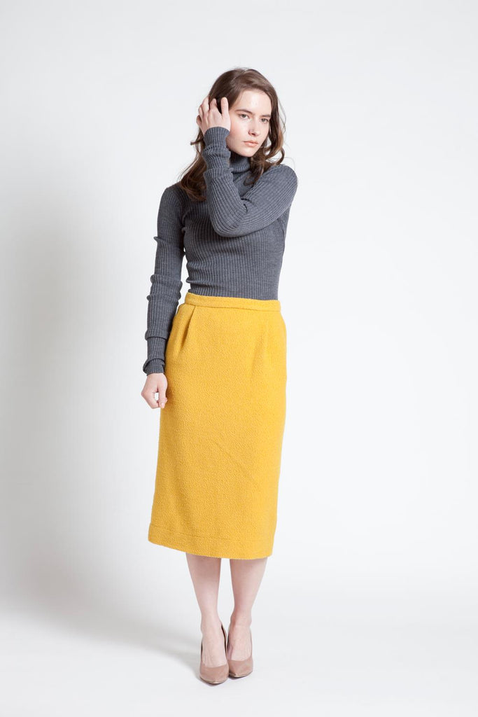 and the 'Stormy High' wool boucle skirt, available in mustard and black.