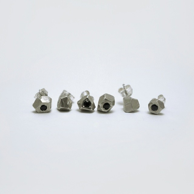 Individually hand carved geometric studs cast in sterling sliver and gold plated bronze. Each one is unique and will bear individual characteristics. Gemstone options - Black Spinel, Blue Sapphire, Aquamarine, Amethyst, Ruby, Emerald, Champagne CZ, Opal.