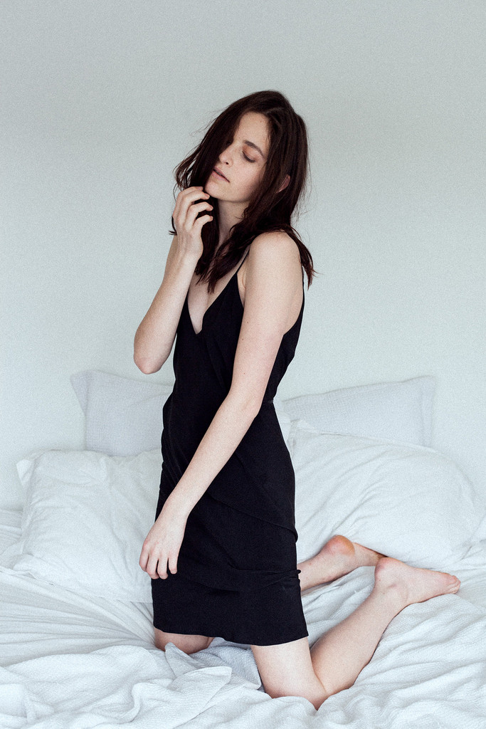 The simplest of bias cut slip dress with diamond shaped paneling. Knee length with adjustable elastic belt at waist.