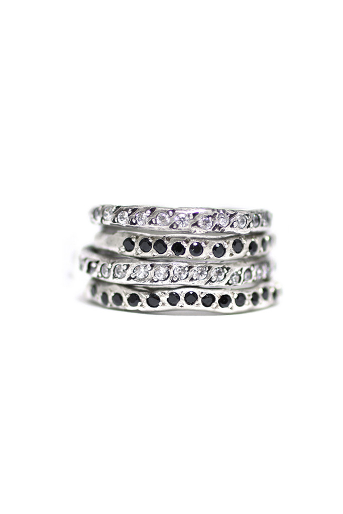 Hand carved organic band with tiny sparkling gemstones embedded in the surface. Available in sterling silver with black spinels or white sapphires.