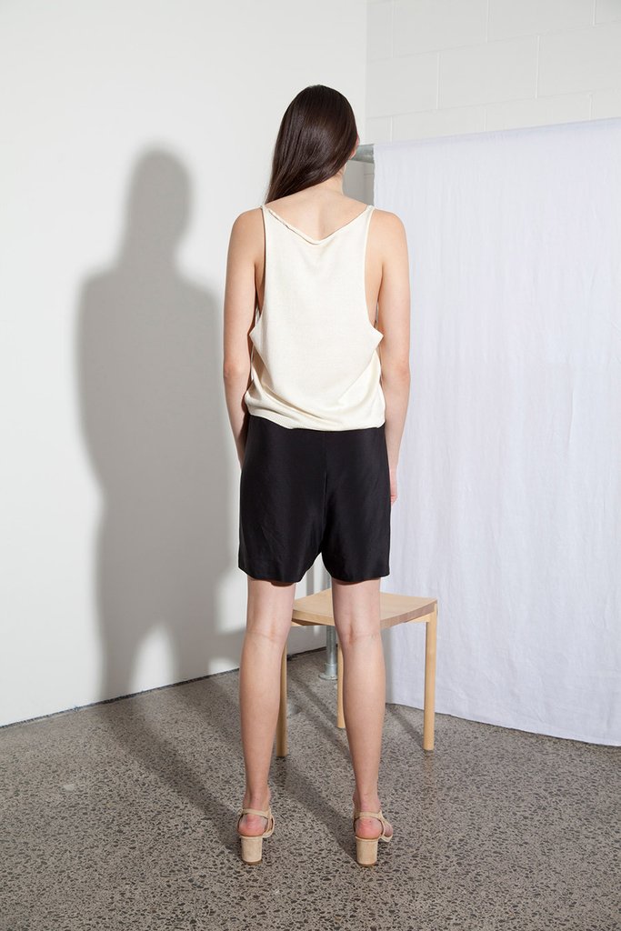 A very luxurious pure silk, dream tank top, intended to be worn in a strong fluid way. It is easily worn both ways - one side with low V-neck and thin straps the other side high neck with flattering cut away at the shoulders.