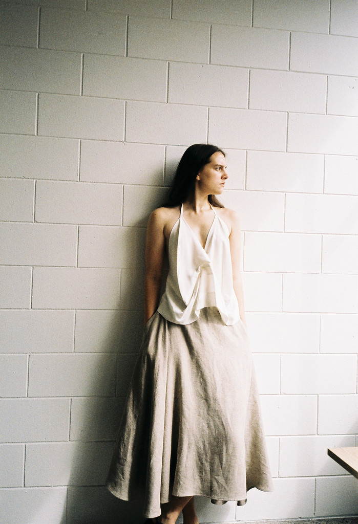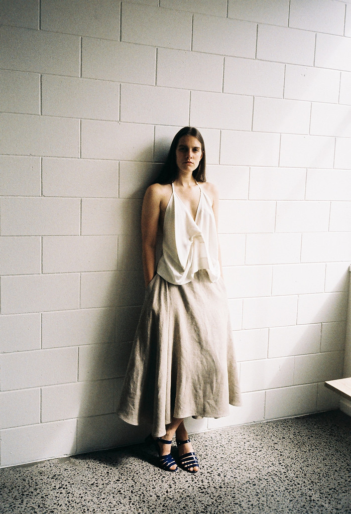 A beautiful new signature Miss Crabb silk camisole top. Simply tied up around the neck with a low cut back the diamond cut draping gives this top a unique and effortless fit.