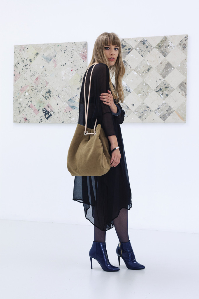 The new Miss Crabb bag! For girls and for boys - a large, four pocket hold-all pouch style bag made from heavy woven linen and raw silk yarns, featuring russet leather drawstring straps. The bag has four internal pockets for holding everything you carry, including A4 diaries and notebook computers. The drawstring straps can be drawn in a number of ways to allow for various ways of wearing and utility. The natural materials of this bag wear well and age beautifully.