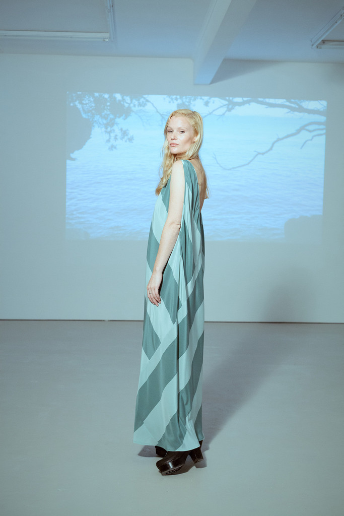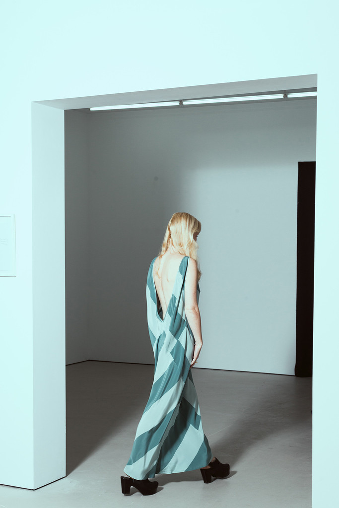A very full bias-cut full length dress with low cut V-neck at the back and high cut neck line at the front. A very beautiful new Miss Crabb piece made in limited edition striped print silk crepe de chine.
