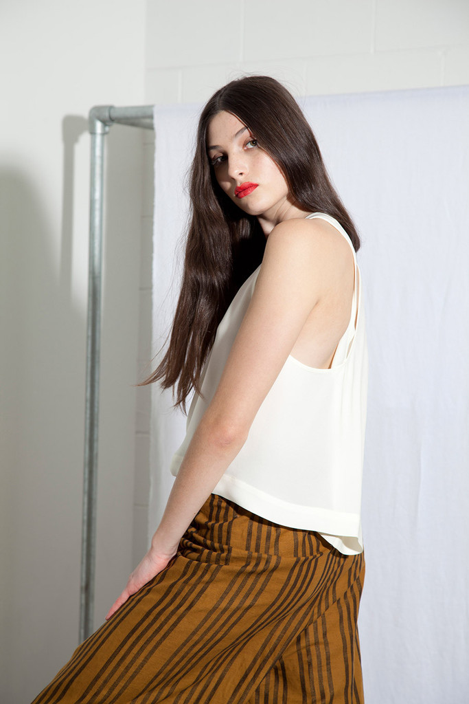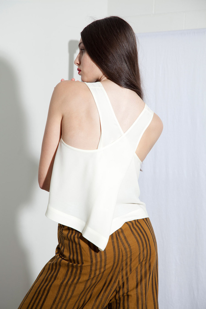A classic Miss Crabb singlet style with very minimalist silhouette and cut, one of our all time favourite pieces. Very straight cut with scooped neck line drawing in to a racer back crossed at the back to achieve subtle and beautiful shaping. Such a simple easy to wear piece for all occasions.