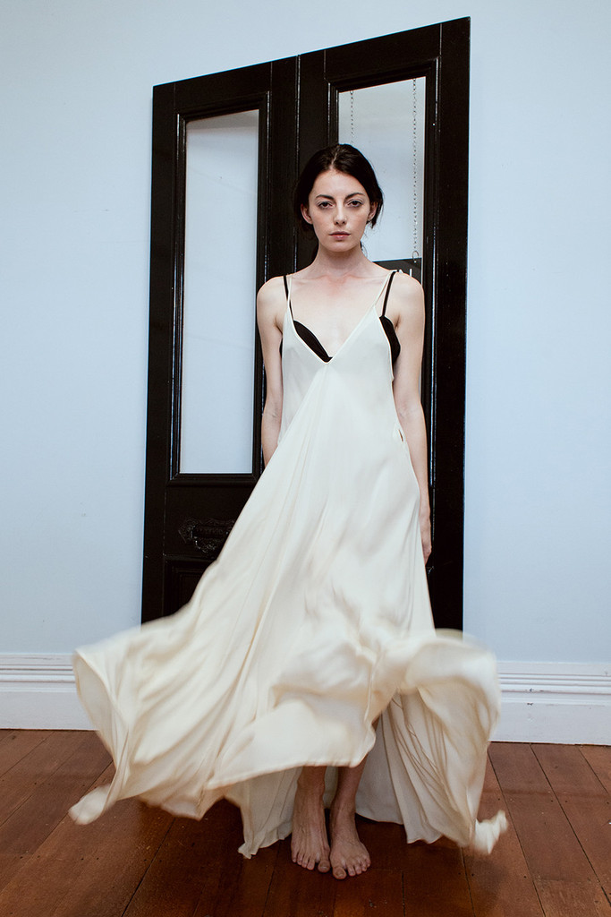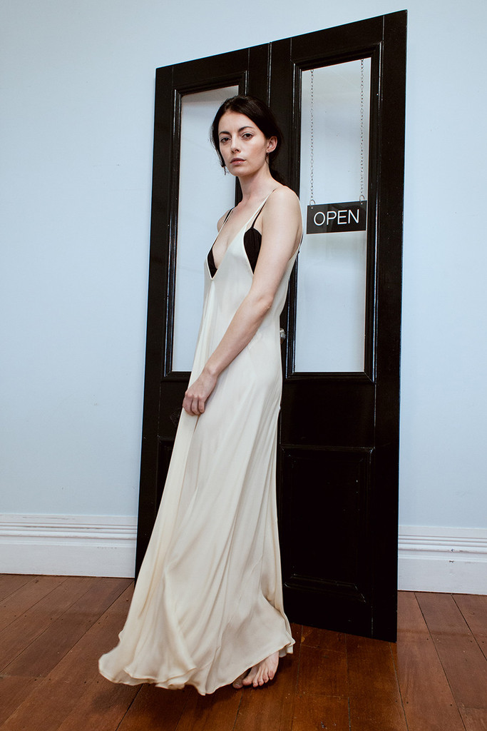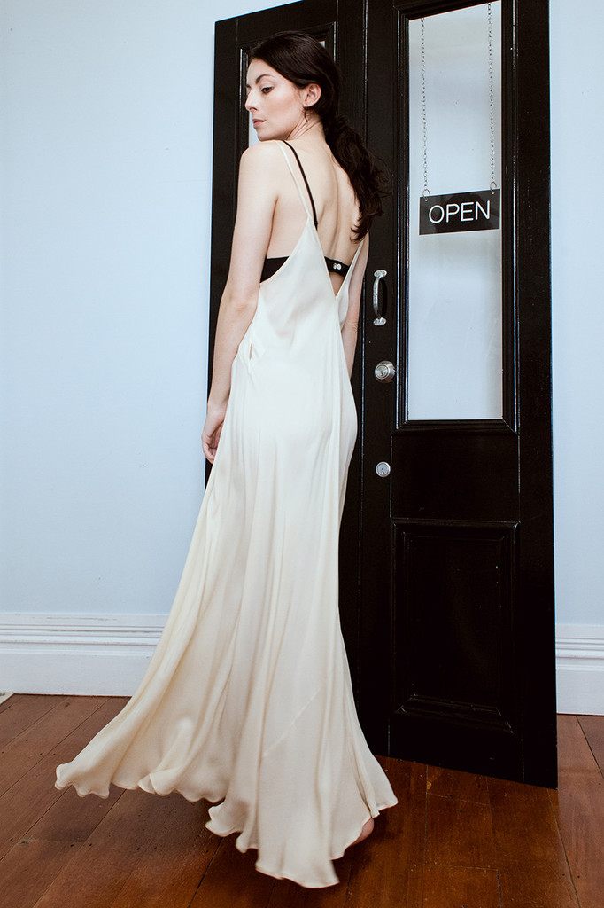 A full length, full volume bias cut dress with thin straps. Beautiful worn loose and full or belted with the matching silk sash. The dress features little holes at the waist for internal belting and tying options. This is a great dress for casual or glamorous occasions.