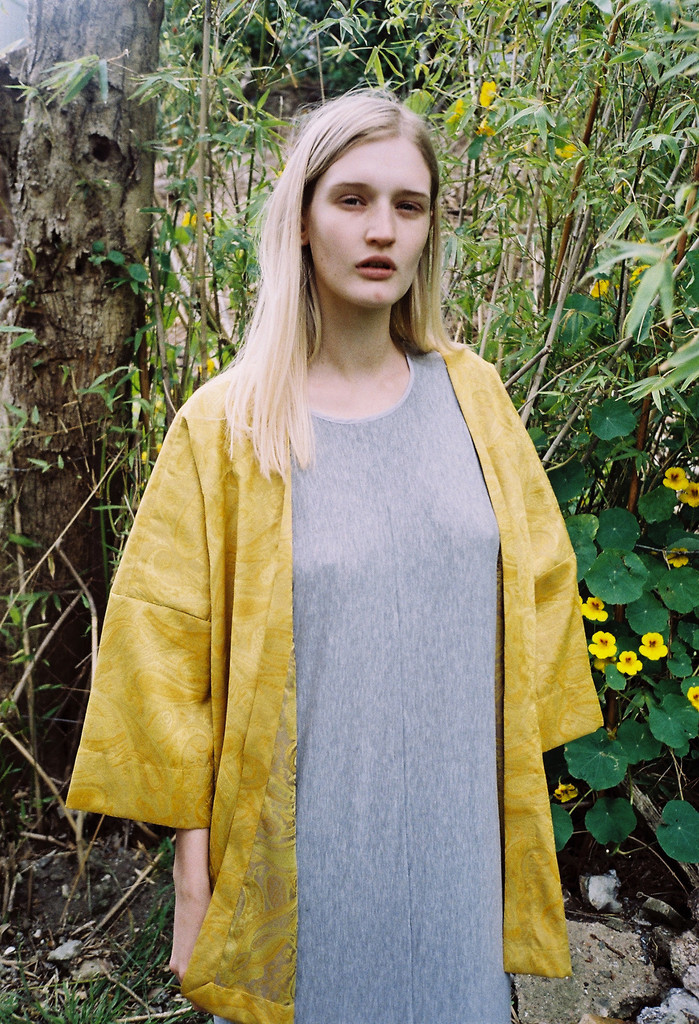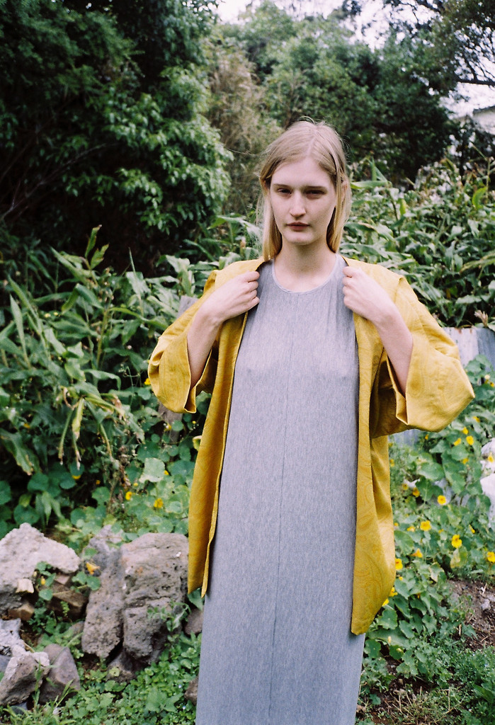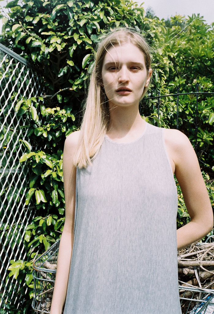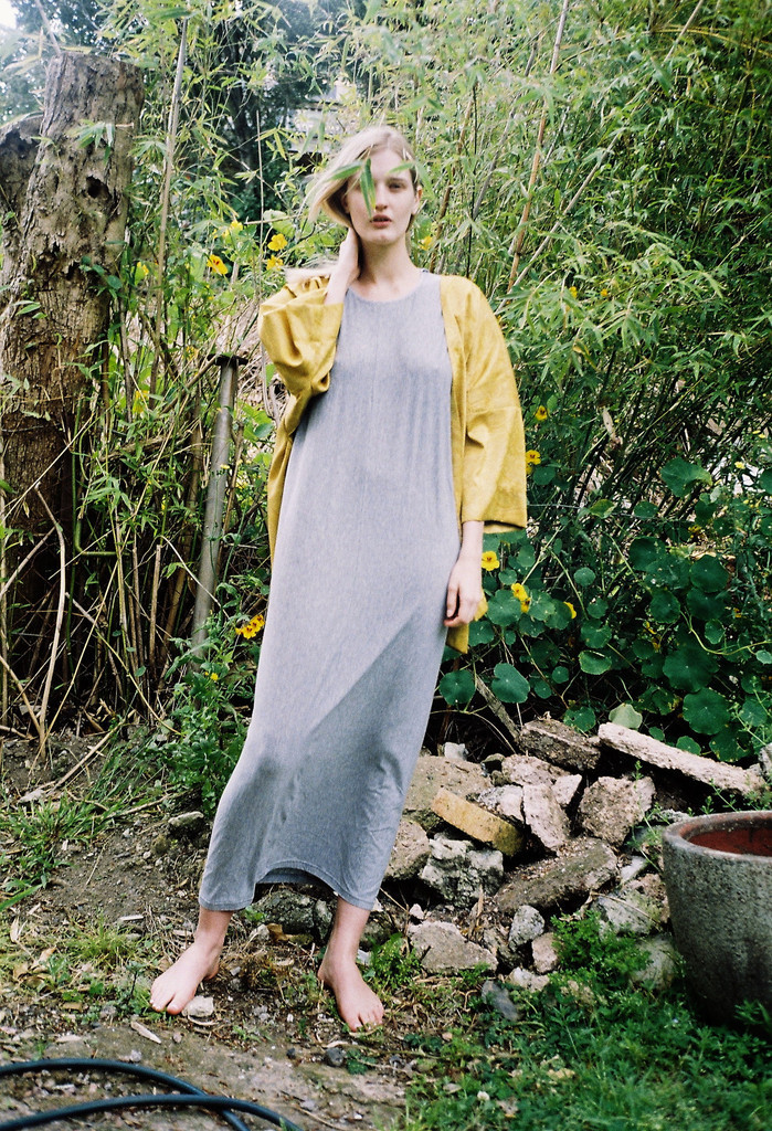 A full length, high cut dress with cut-away shoulders, made from grey cotton marle. Features a low split at the back bodice and sides with rouleau button up at the back neck. A perfect casual summer dress.