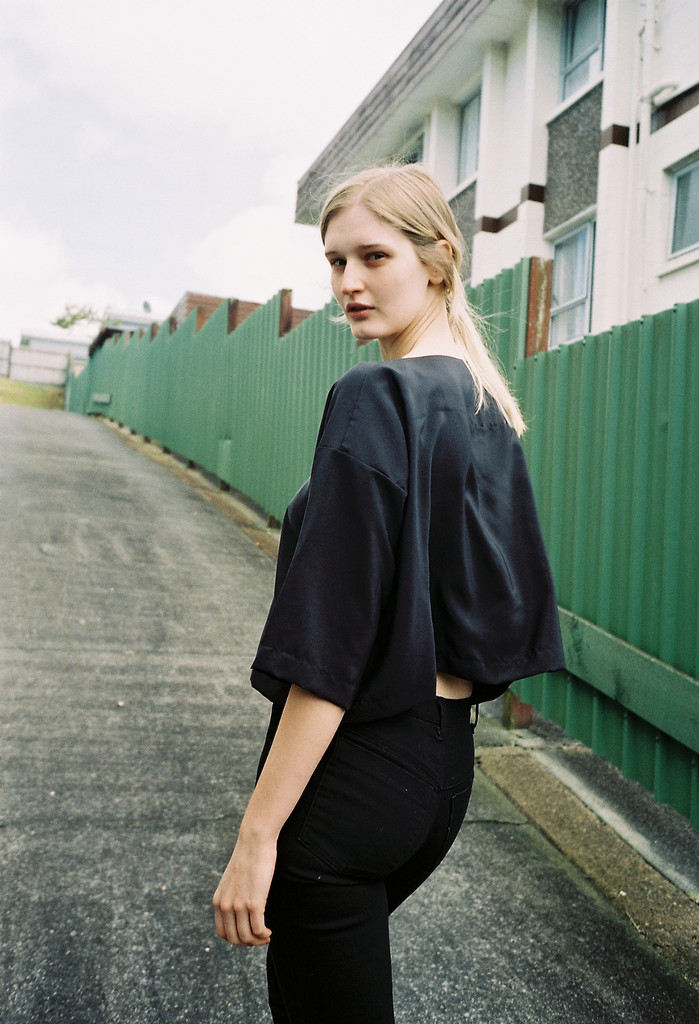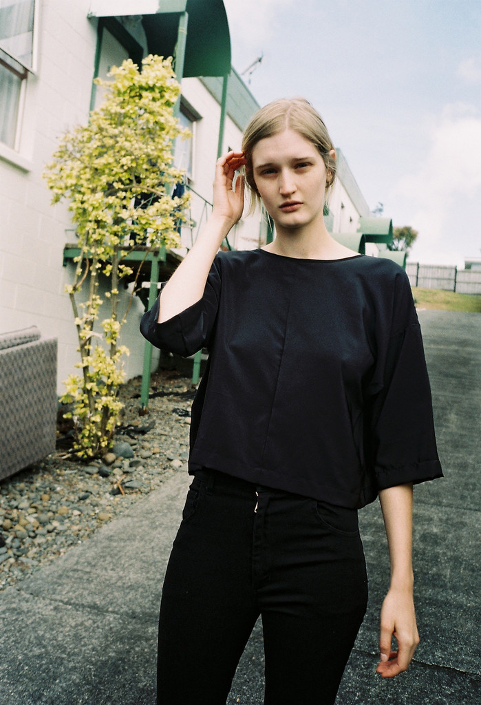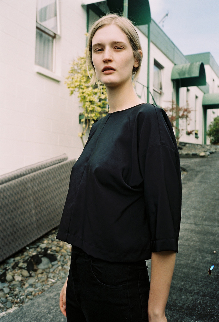 An effortless and versatile silk T'shirt style top which sits at the waist. Can be worn both ways - with a high-cut squared neckline on one side and gentle scooped neckline the other, with soft drape and tilt and loose bracelet length sleeves.